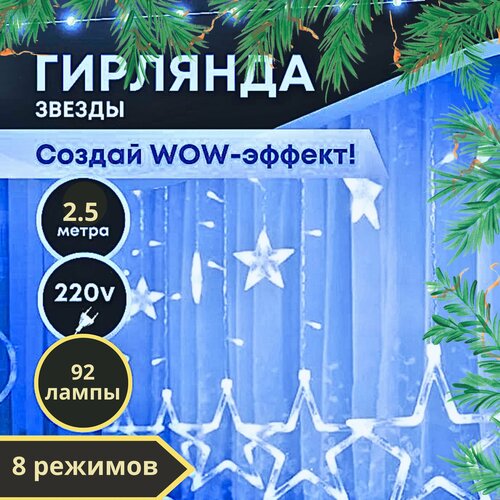 Гирлянда бахрома звезды 2,5м, cветодиодная для помещения, свет холодно-белый, 92 LED, 8 режимов, от сети 220В, прозрачный провод, гирлянда на елку