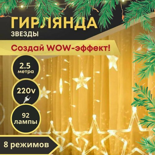 Гирлянда бахрома звезды 2,5м, cветодиодная для помещения, свет тепло-белый, 92 LED, 8 режимов, от сети 220В, прозрачный провод, гирлянда на елку