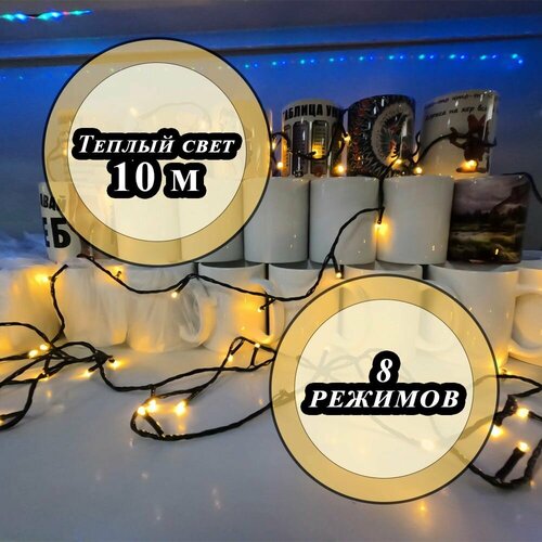 Электрогирлянда нить светодиодная 100 ламп, 10 м, питание от сети 220В, свет теплый, 8 режимов, черный провод, гирлянда на елку, на окно