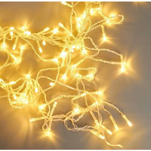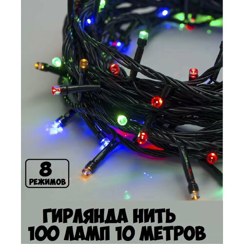 Электрогирлянда нить светодиодная 100 ламп, 10 м, питание от сети 220В, свет теплый, 8 режимов, черный провод, гирлянда на елку, на окно