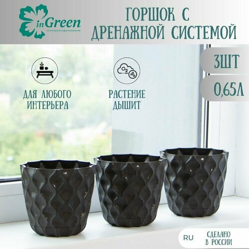 Набор горшков для цветов 3шт по 0,65л (ДхШхВ) 11,5х11,5х10,4 см с дренажной сеткой и съемным поддоном, горшок для цветов пластиковый, горький шоколад