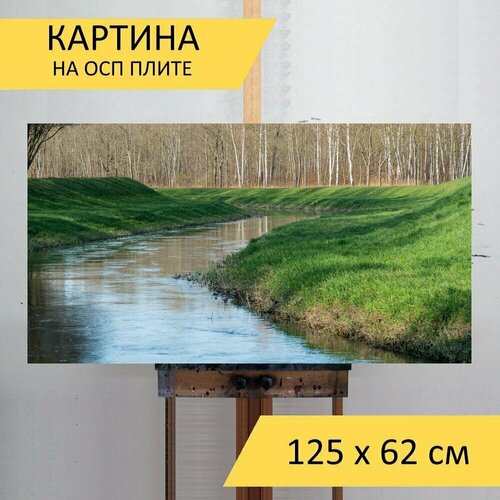 Картина на ОСП 125х62 см. "Ручей, деревья, трава" горизонтальная, для интерьера, с креплениями