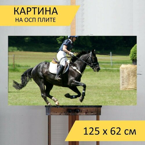 Картина на ОСП 125х62 см. "Езда на лошади, лошадь, конный спорт" горизонтальная, для интерьера, с креплениями