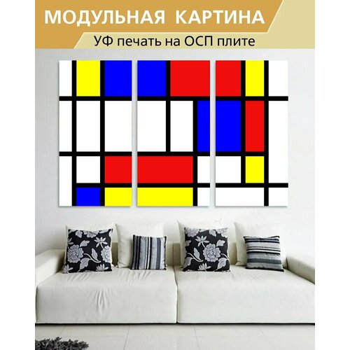 Модульная картина на ОСП "Мондриан, красный, синий" 188x125 см. 3 части для интерьера на стену