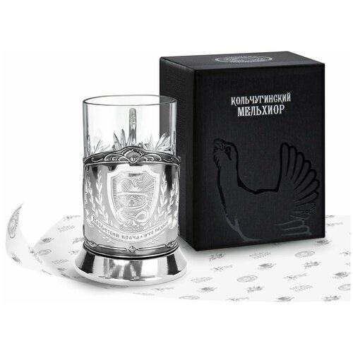 Комплектация: Подстаканник (никелированная латунь марки Л68), Стакан (Хрусталь, 220 мл), Подарочная коробка (15 х 12 х 12 см).