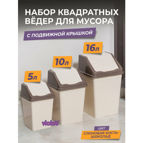 Мусорное ведро для кухни с крышкой квадратное, набор 3шт: 5л + 10л + 16л, цвет слоновая кость / контейнер для мусора для туалета