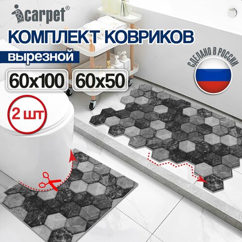 Коврики на пол вырезные icarpet PRINT антискользящих (128) "Соты Мрамор" 60х100+60х50 см / 2 шт/чёрно-серый