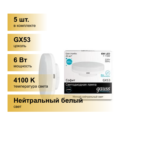 (5 шт.) Светодиодная лампочка Gauss Elementary GX53 6W(460lm) 4100 4K 75x26.4 пластик/алюм. 83826