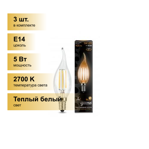 (3 шт.) Светодиодная лампочка Gauss Filament Свеча на ветру E14 5W(420lm) 2700K 2K 122x35 филамент (нитевидная), прозр. 104801105