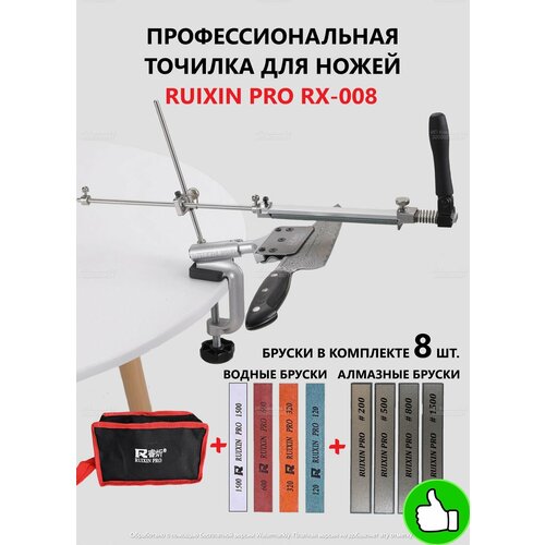 Точилка для ножей профессиональная Ruixin PRO RX-008 4-го поколения с поворотным механизмом на 360гр. Новая генерация 2023г. (улучшенный материал струбцины, более крепкий и надёжный), предназначена для профессиональной заточки ножей и другого инструмента (стамески, ножницы, лезвия рубанков и ледобуров и др). Преимуществом данной точилки является простота использования и поворотный механизм с вращением на 360 градусов, что позволяет точить разные стороны ножа не вынимая его из станка. Крепление к столу осуществляется при помощи струбцины. Крепление ножа с помощью губок и трех винтов. Этой точильной системой, даже без навыков, Вы можете профессионально заточить складной нож , кухонный нож , охотничий нож , туристический нож и мн. др. В комплекте уже имеются 4 высококачественных точильных камня для заточки