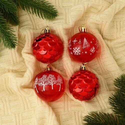Набор шаров пластик d-5,5 см, 4 шт Новогодние забавы шишки геометрия, красный