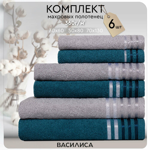Набор махровых полотенец Селена 30х60, 50х80, 70х130, 6шт, Серый, Изумруд
