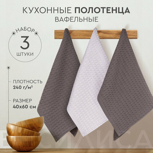 серый, бежевыйНабор кухонных полотенец 3 шт, размер 40х60 от Василиса выполнены из прочного и долговечного вафельного материала, неприхотливого в уходе. Это мягкое полотенце хлопок 100% подходит как для детей, так и для взрослых, а подарочный набор из этого комплекта порадует любую хозяйку. Оно идеально для лица и рук, а также подойдет для сушки посуды в вашей кухне. Полотенце быстро сохнет после использования. Рисунок на нем делает его стильным и уникальным аксессуаром в вашей ванной комнате. Вафельные полотенца превосходят махровые полотенца и полотенца кухонные из микрофибры в нескольких аспектах: не задерживают запахи и обеспечивают быстрое впитывание.