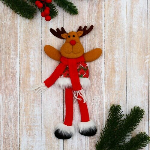 Мягкая подвеска Олень в костюмчике с орнаментом, длинные ножки 8х24 см, красный 2 шт