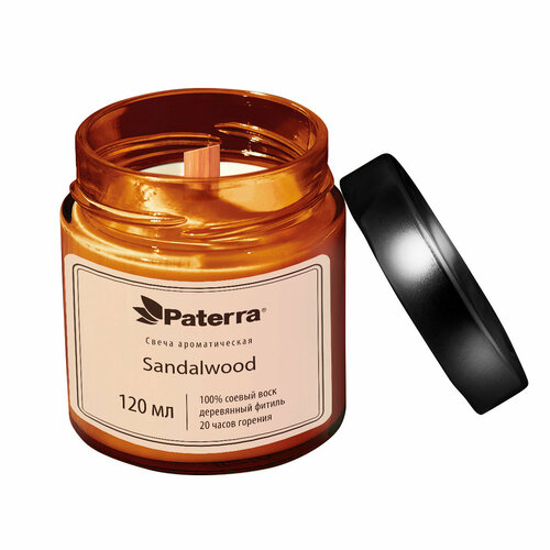 Свеча ароматическая в стеклянной банке с крышкой, с деревянным фитилем, аромат Sandalwood, 120 мл, PATERRA (401-293)