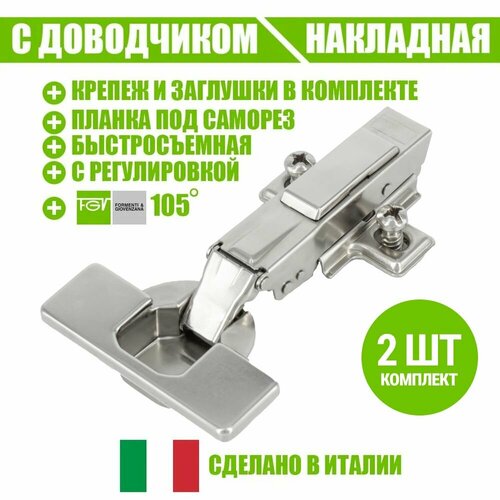 Петля мебельная FGV OMNIA L, накладная, со встроенным доводчиком и ответной планкой. Открывание 105 градусов. Комплект из 2 шт для кухонного фасада, шкафа и другой мебели
