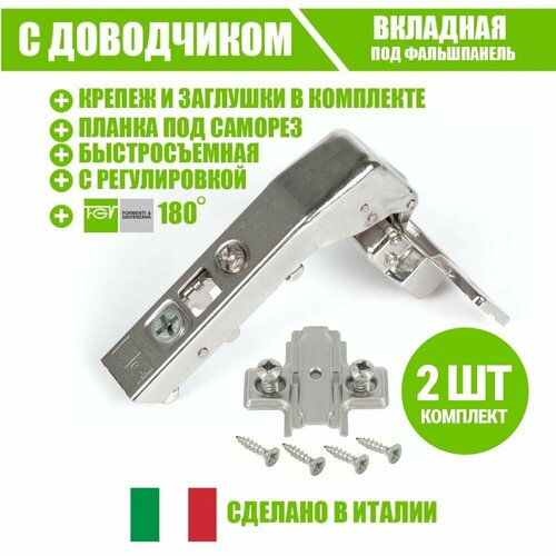 Петля мебельная FGV OMNIA L, под фальшпанель, 180 градусов, со встроенным доводчиком и ответной планкой. Комплект из 2 шт для кухонного фасада, шкафа и другой мебели