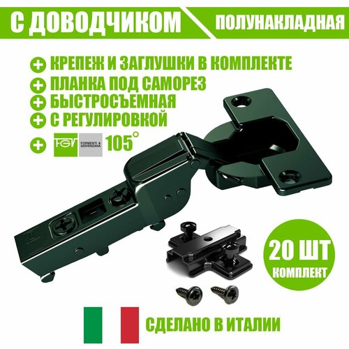 Петля черная, мебельная FGV OMNIA L, полунакладная, со встроенным доводчиком и ответной планкой. Открывание 105 градусов. Комплект из 20 шт для кухонного фасада, шкафа и другой мебели