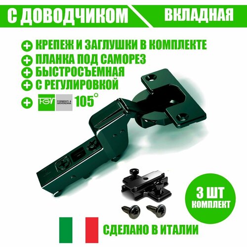 Петля черная, мебельная FGV OMNIA L, вкладная, со встроенным доводчиком и ответной планкой. Открывание 105 градусов. Комплект из 3 шт для кухонного фасада, шкафа и другой мебели