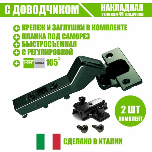 Петля мебельная FGV OMNIA L, угловая 45 градусов, со встроенным доводчиком и ответной планкой, черная. Комплект из 2 шт для кухонного фасада, шкафа и другой мебели