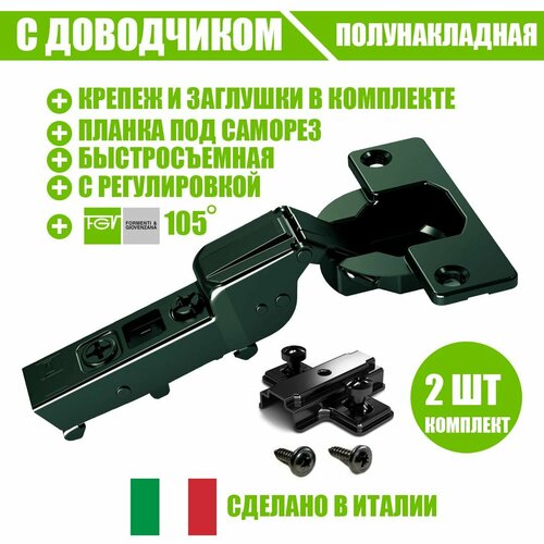 Петля черная, мебельная FGV OMNIA L, полунакладная, со встроенным доводчиком и ответной планкой. Открывание 105 градусов. Комплект из 2 шт для кухонного фасада, шкафа и другой мебели