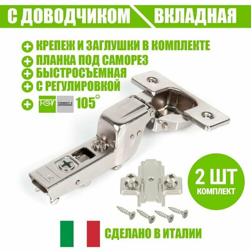Петля мебельная FGV OMNIA L, вкладная, со встроенным доводчиком и ответной планкой. Открывание 105 градусов. Комплект из 2 шт для кухонного фасада, шкафа и другой мебели
