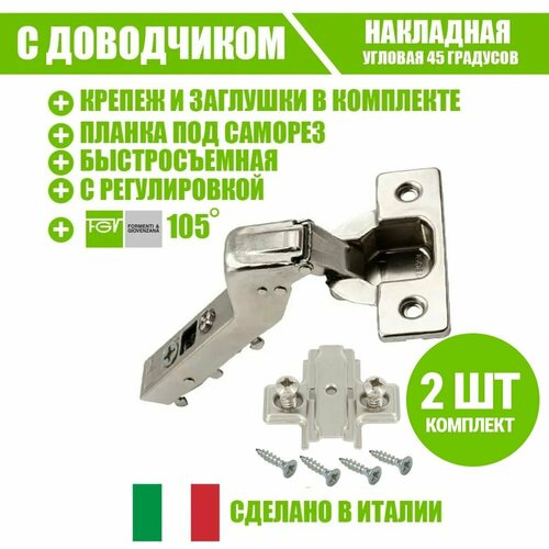 Петля мебельная FGV OMNIA L, угловая +45 градусов, со встроенным доводчиком и ответной планкой. Комплект из 2 шт для кухонного фасада, шкафа и другой мебели