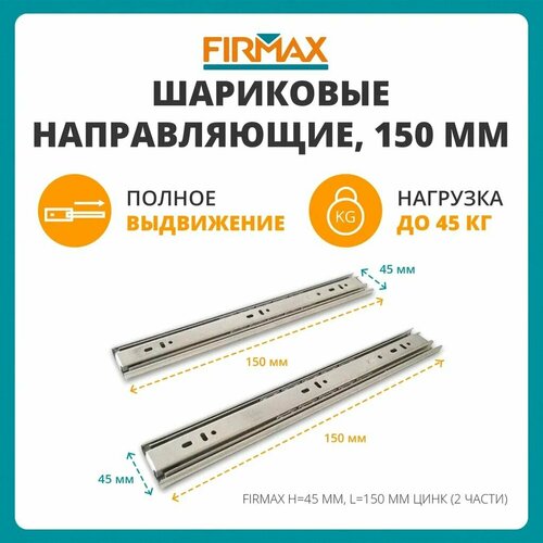 Шариковые направляющие Firmax полного выдвижения, H=45 мм, L=150 мм цинк (2 части)
