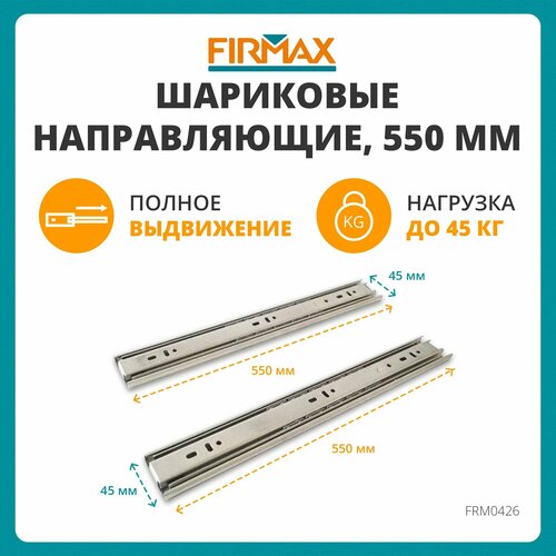 Шариковые мебельные направляющие для ящика 550 мм, тумб и комодов Firmax полного выдвижения, H45 мм, цинк (2 части)