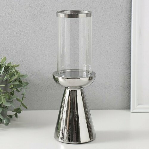 Подсвечник керамика, стекло на 1 свечу "Гладь" d=8 см серебро 10х10х29,5 см