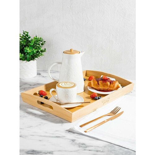 Поднос сервировочный прямоугольный 43Х29см с бортами 5см ручками Бамбук Бежевый