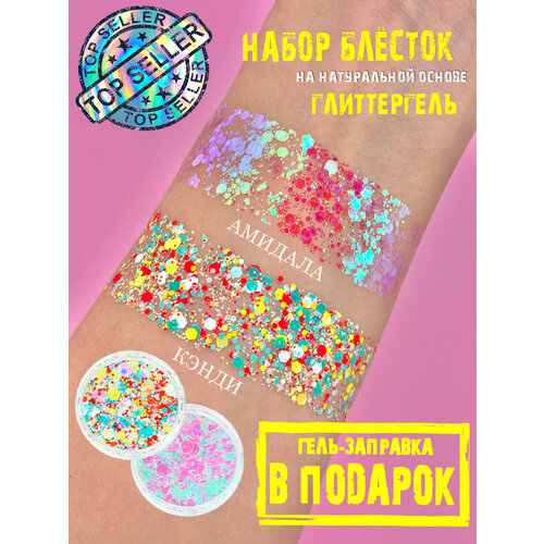 Queridos Glitters Глиттер набор. Блестки для лица и тела. Блестки для глаз. Цвета: 3 мл "Кэнди", "Амидала" + гель-заправка 6мл