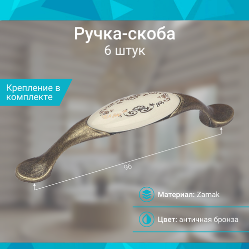 Ручка-скоба 96 мм, античная бронза с узором - 6 шт