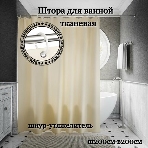 Штора для ванной тканевая INTERIORHOME бежевая, ширина 200 см, высота 200 см, с кольцами