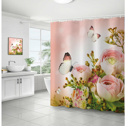 Штора (занавеска) для ванной / душа водоотталкивающая тканевая с кольцами 180 x 180 см Бабочки 10
