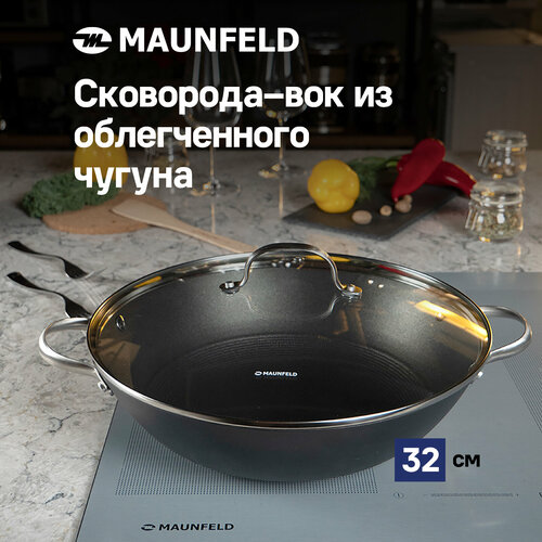 Сковорода-вок MAUNFELD HOWARD MWP32LCL15 из облегченного чугуна со стеклянной крышкой, 32 см