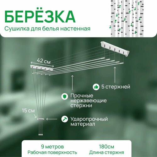 Сушилка оснащена 5 металлическими прутьями длиной 120 см, что обеспечивает достаточное пространство для сушки большого количества белья. Рабочая длина каждого прута составляет 6 см, что позволяет сушить даже объемные вещи. Максимальная нагрузка на сушилку составляет 9 кг, что делает ее подходящей для сушки различных типов белья.