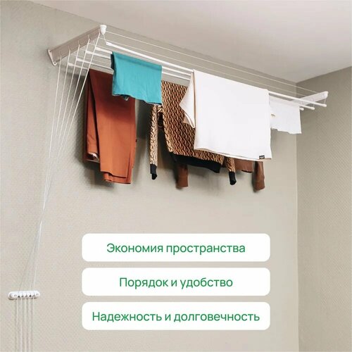 Она оснащена потолочным креплением, что обеспечивает надежность и безопасность использования. Конструкция "лиана" позволяет экономить пространство в помещении и обеспечивает равномерное распределение белья на всех уровнях.