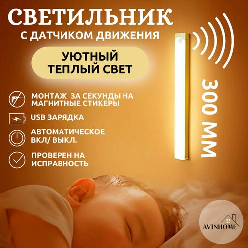Светильник ночник светодиодный, c датчиком движения, беспроводной, на аккумуляторе, на магнитном креплении от AVINHOME. Панель 300 мм. Теплый желтый свет.
