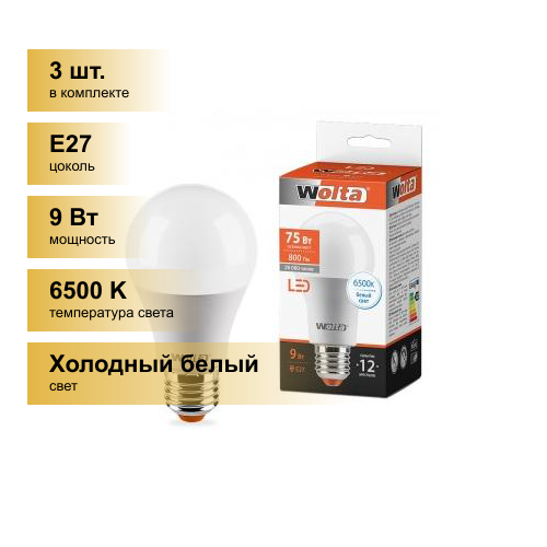 (3 шт.) Светодиодная лампочка Wolta лампа св/д ЛОН A60 E27 9W(800lm) 6500К 6K 120x60 25W60BL9E27