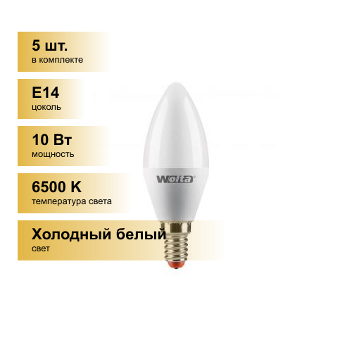 (5 шт.) Светодиодная лампочка Wolta лампа св/д свеча C37 E14 10W(900Lm) 6500K 6K 115X37 25WC10E14