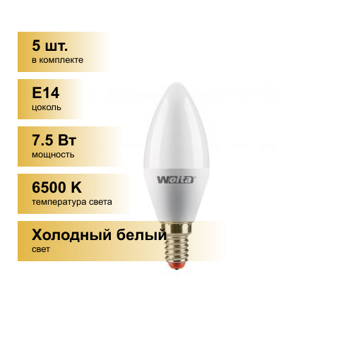 (5 шт.) Светодиодная лампочка Wolta лампа св/д свеча C37 E14 7,5W(625Lm) 6500K 6K 100X37 25WC7.5E14