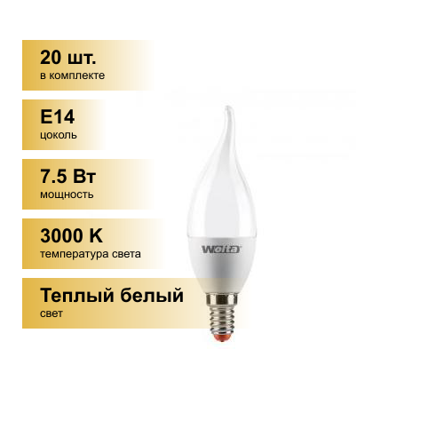 (20 шт.) Светодиодная лампочка Wolta лампа св/д свеча на ветру C37 E14 7,5W(625Lm) 3000K 2K 125X37 25YCD7.5E14