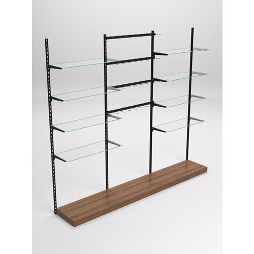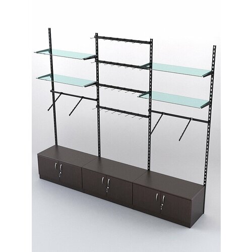 Настенная система с подиумами поручнем стекл полками и под крючки для одежды "LOFT" №7-1, Дуб Венге 270 x 45 x 240 см
