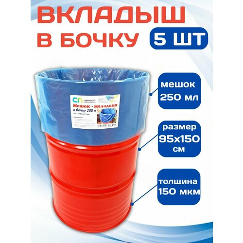 Вкладыш в бочку 200 л (мешок 250 л), 150 мкм, с антибактериальной добавкой, синий, 5 шт/уп