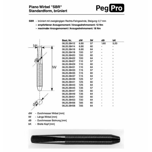 Вирбели, колки для роялей и пианино, 10 штук, размер 7,25 x 60 , полированные синие-чёрные правые, профессиональное качество, сделано в Германии