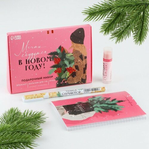 Подарочный набор блокнот, ручка и бальзам для губ "Мечты сбудутся в новом году!"