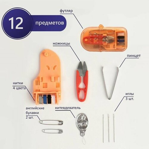 Швейный набор дорожный, 12 предметов, в футляре, 4,2 x 8 см