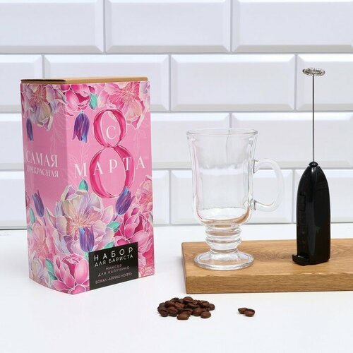 Подарочный набор кружка 200 мл, капучинатор от батареек "8 Марта", 21х10 х8 см модель LBR-04 96917