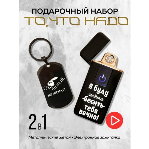 adultПодарочный набор мужчине - Сенсорная USB зажигалка с гравировкой + брелок жетон с гравировкой